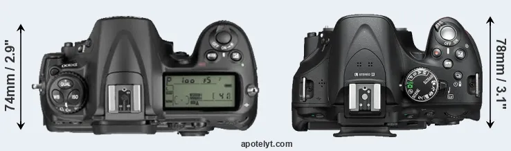The side-by-side display below illustrates the physical size and weight of the Nikon D300 and the Nikon D5200. The two cameras are presented according to their relative size. Three consecutive perspectives from the front, the top, and the back are available. All width, height and depth measures are rounded to the nearest millimeter.