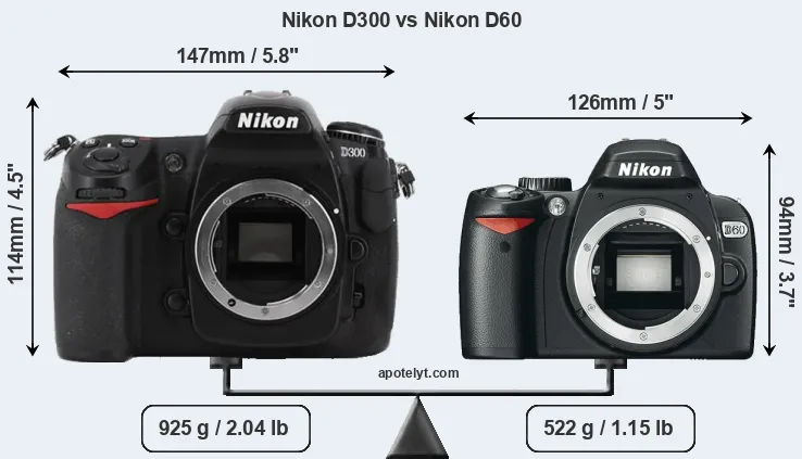 The side-by-side display below illustrates the physical size and weight of the Nikon D300 and the Nikon D60. The two cameras are presented according to their relative size. Three successive views from the front, the top, and the rear are shown. All size dimensions are rounded to the nearest millimeter.