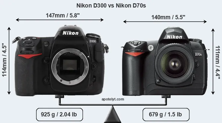 If the front view area (width x height) of the cameras is taken as an aggregate measure of their size, the Nikon D70s is notably smaller (7 percent) than the Nikon D300. Moreover, the D70s is markedly lighter (27 percent) than the D300. It is worth mentioning in this context that the D300 is splash and dust resistant, while the D70s does not feature any corresponding weather-sealing.