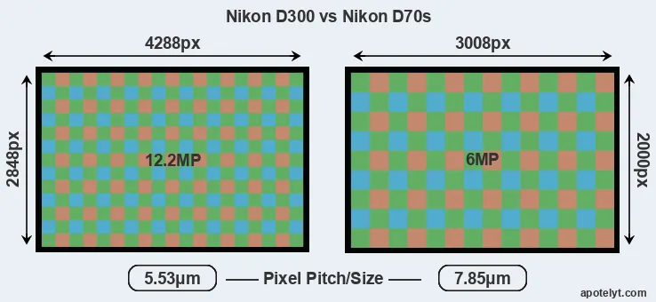 With 12.2MP, the D300 offers a higher resolution than the D70s (6MP), but the D300 has smaller individual pixels (pixel pitch of 5.53μm versus 7.85μm for the D70s). However, the D300 is a much more recent model (by 2 years and 4 months) than the D70s, and its sensor will have benefitted from technological advances during this time that enhance the light gathering capacity of its pixels.