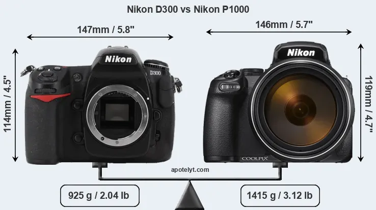 The physical size and weight of the Nikon D300 and the Nikon P1000 are illustrated in the side-by-side display below. The two cameras are presented according to their relative size. Three successive views from the front, the top, and the rear are shown. All size dimensions are rounded to the nearest millimeter.