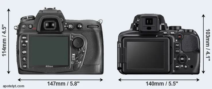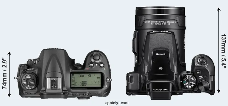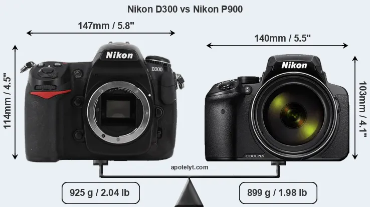 The side-by-side display below illustrates the physical size and weight of the Nikon D300 and the Nikon P900. The two cameras are presented according to their relative size. Three successive views from the front, the top, and the rear are shown. All width, height and depth dimensions are rounded to the nearest millimeter.
