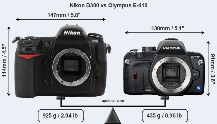 An illustration of the physical size and weight of the Nikon D300 and the Olympus E-410 is provided in the side-by-side display below. The two cameras are presented according to their relative size. Three consecutive perspectives from the front, the top, and the back are available. All size dimensions are rounded to the nearest millimeter.