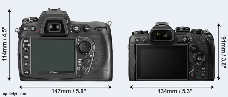 The side-by-side display below illustrates the physical size and weight of the Nikon D300 and the Olympus E-M1 III. The two cameras are presented according to their relative size. Three consecutive perspectives from the front, the top, and the back are available. All width, height and depth dimensions are rounded to the nearest millimeter.