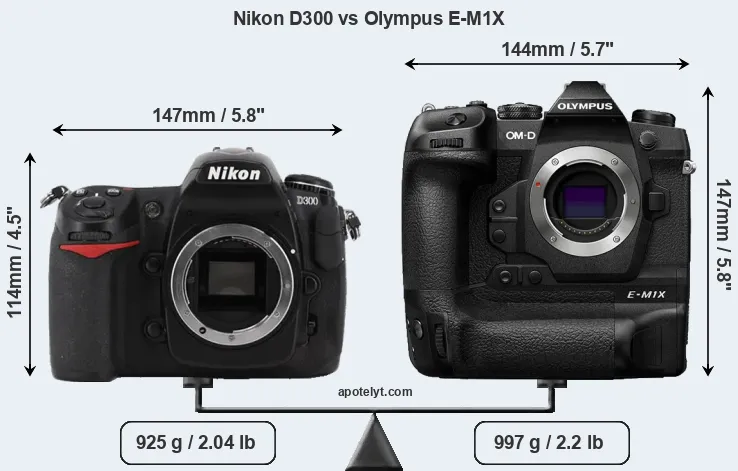 An illustration of the physical size and weight of the Nikon D300 and the Olympus E-M1X is provided in the side-by-side display below. The two cameras are presented according to their relative size. Three consecutive views from the front, the top, and the rear side are shown. All width, height and depth measures are rounded to the nearest millimeter.