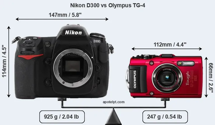 An illustration of the physical size and weight of the Nikon D300 and the Olympus TG-4 is provided in the side-by-side display below. The two cameras are presented according to their relative size. Three consecutive views from the front, the top, and the rear side are shown. All size dimensions are rounded to the nearest millimeter.