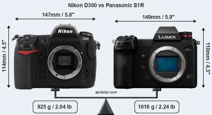 An illustration of the physical size and weight of the Nikon D300 and the Panasonic S1R is provided in the side-by-side display below. The two cameras are presented according to their relative size. Three successive views from the front, the top, and the rear are shown. All width, height and depth dimensions are rounded to the nearest millimeter.