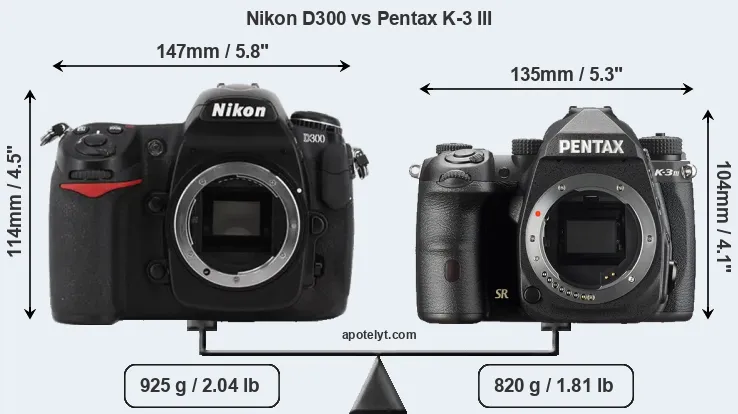The side-by-side display below illustrates the physical size and weight of the Nikon D300 and the Pentax K-3 III. The two cameras are presented according to their relative size. Three consecutive perspectives from the front, the top, and the back are available. All width, height and depth dimensions are rounded to the nearest millimeter.