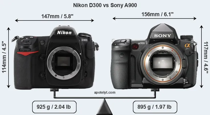 The side-by-side display below illustrates the physical size and weight of the Nikon D300 and the Sony A900. The two cameras are presented according to their relative size. Three successive views from the front, the top, and the rear are shown. All width, height and depth measures are rounded to the nearest millimeter.