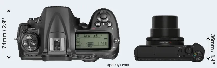 The physical size and weight of the Nikon D300 and the Sony HX90V are illustrated in the side-by-side display below. The two cameras are presented according to their relative size. Three successive views from the front, the top, and the rear are shown. All width, height and depth dimensions are rounded to the nearest millimeter.