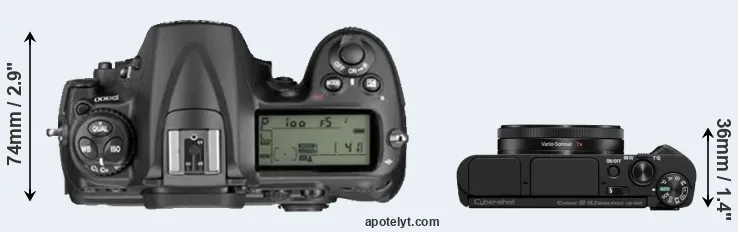 The physical size and weight of the Nikon D300 and the Sony HX99 are illustrated in the side-by-side display below. The two cameras are presented according to their relative size. Three successive views from the front, the top, and the rear are shown. All width, height and depth dimensions are rounded to the nearest millimeter.