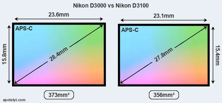 Both cameras under consideration feature an APS-C sensor, but their sensors differ slightly in size. The sensor area in the D3100 is 5 percent smaller. They nevertheless have the same format factor of 1.5. Both cameras have a native aspect ratio (sensor width to sensor height) of 3:2.