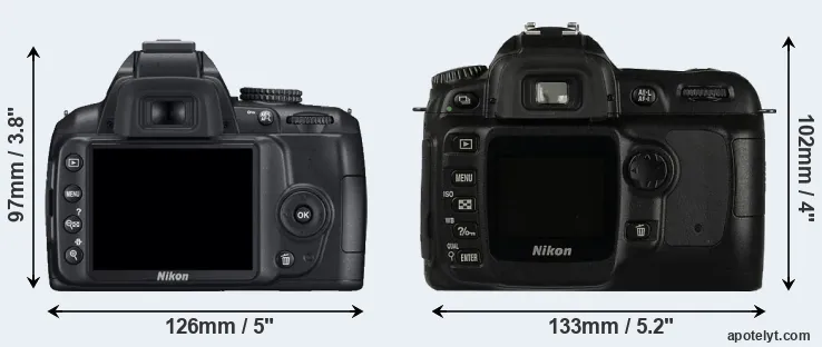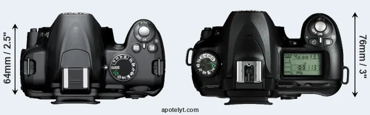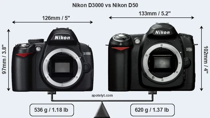 The side-by-side display below illustrates the physical size and weight of the Nikon D3000 and the Nikon D50. The two cameras are presented according to their relative size. Three consecutive perspectives from the front, the top, and the back are available. All width, height and depth measures are rounded to the nearest millimeter.