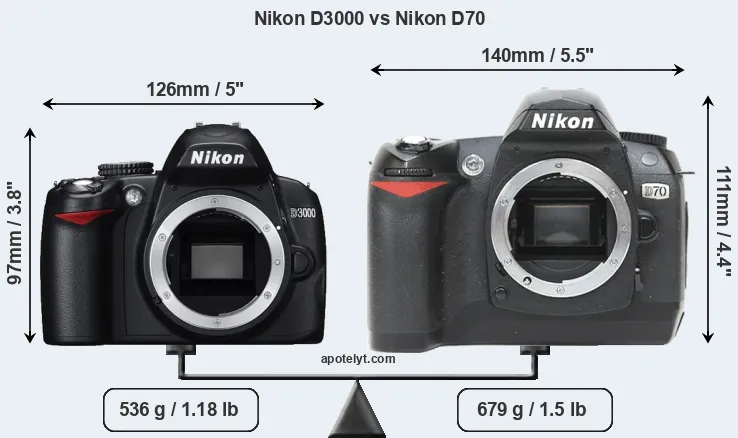 The physical size and weight of the Nikon D3000 and the Nikon D70 are illustrated in the side-by-side display below. The two cameras are presented according to their relative size. Three consecutive perspectives from the front, the top, and the back are available. All width, height and depth measures are rounded to the nearest millimeter.