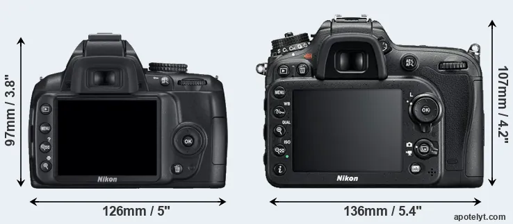 The physical size and weight of the Nikon D3000 and the Nikon D7200 are illustrated in the side-by-side display below. The two cameras are presented according to their relative size. Three successive views from the front, the top, and the rear are shown. All width, height and depth dimensions are rounded to the nearest millimeter.