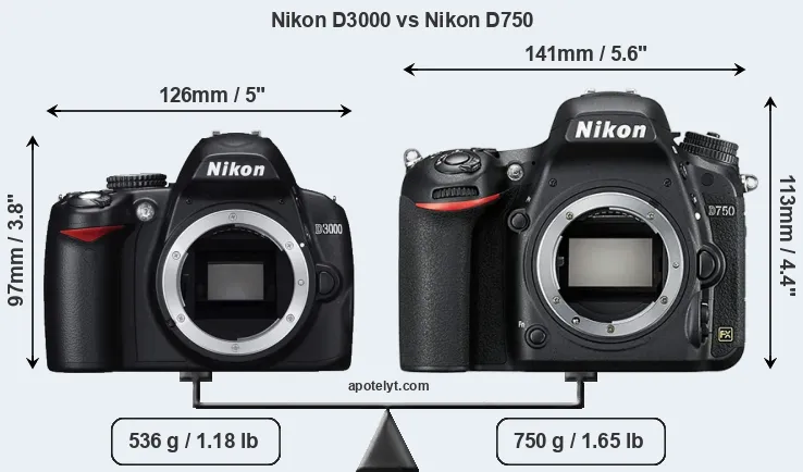 If the front view area (width x height) of the cameras is taken as an aggregate measure of their size, the Nikon D750 is notably larger (30 percent) than the Nikon D3000. Moreover, the D750 is substantially heavier (40 percent) than the D3000. It is noteworthy in this context that the D750 is splash and dust-proof, while the D3000 does not feature any corresponding weather-sealing.