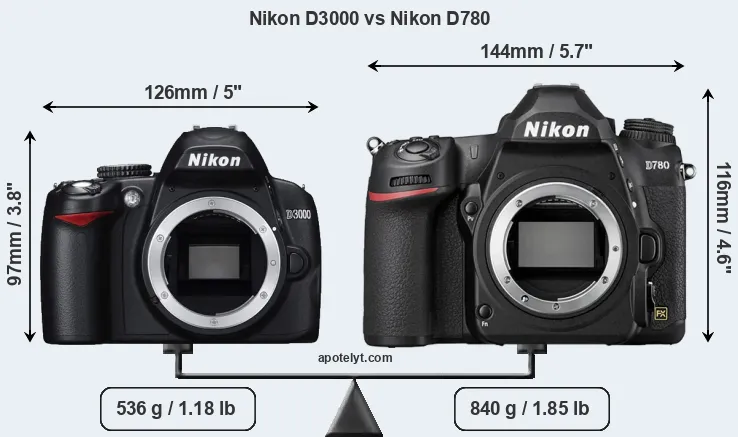 An illustration of the physical size and weight of the Nikon D3000 and the Nikon D780 is provided in the side-by-side display below. The two cameras are presented according to their relative size. Three consecutive perspectives from the front, the top, and the back are available. All width, height and depth measures are rounded to the nearest millimeter.