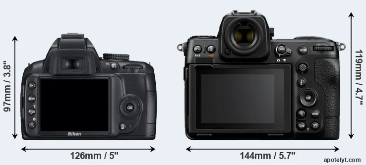 An illustration of the physical size and weight of the Nikon D3000 and the Nikon Z8 is provided in the side-by-side display below. The two cameras are presented according to their relative size. Three consecutive perspectives from the front, the top, and the back are available. All width, height and depth dimensions are rounded to the nearest millimeter.