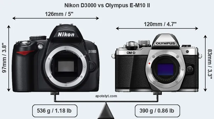 If the front view area (width x height) of the cameras is taken as an aggregate measure of their size, the Olympus E-M10 II is notably smaller (19 percent) than the Nikon D3000. Moreover, the E-M10 II is markedly lighter (27 percent) than the D3000. In this context, it is worth noting that neither the D3000 nor the E-M10 II are weather-sealed.
