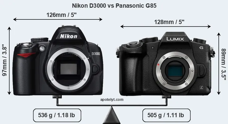 The physical size and weight of the Nikon D3000 and the Panasonic G85 are illustrated in the side-by-side display below. The two cameras are presented according to their relative size. Three successive views from the front, the top, and the rear are shown. All width, height and depth dimensions are rounded to the nearest millimeter.