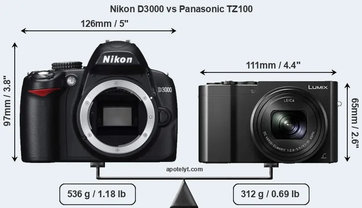 The physical size and weight of the Nikon D3000 and the Panasonic TZ100 are illustrated in the side-by-side display below. The two cameras are presented according to their relative size. Three successive views from the front, the top, and the rear are shown. All width, height and depth measures are rounded to the nearest millimeter.