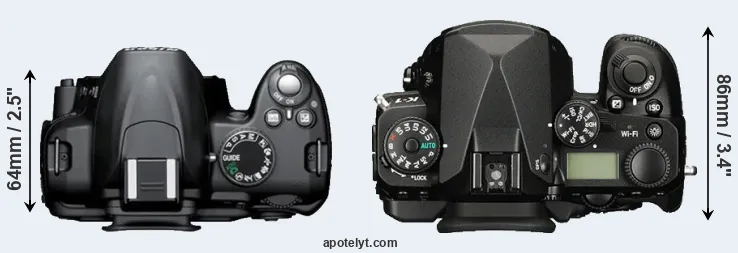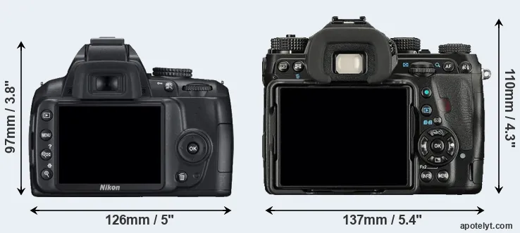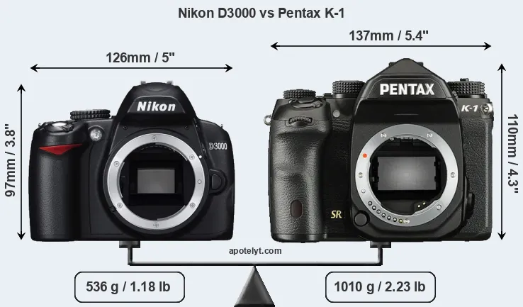 The side-by-side display below illustrates the physical size and weight of the Nikon D3000 and the Pentax K-1. The two cameras are presented according to their relative size. Three consecutive perspectives from the front, the top, and the back are available. All width, height and depth measures are rounded to the nearest millimeter.