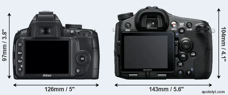 The side-by-side display below illustrates the physical size and weight of the Nikon D3000 and the Sony A77. The two cameras are presented according to their relative size. Three successive views from the front, the top, and the rear are shown. All width, height and depth dimensions are rounded to the nearest millimeter.