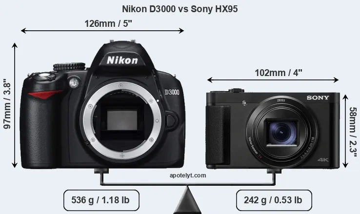 An illustration of the physical size and weight of the Nikon D3000 and the Sony HX95 is provided in the side-by-side display below. The two cameras are presented according to their relative size. Three successive views from the front, the top, and the rear are shown. All size dimensions are rounded to the nearest millimeter.