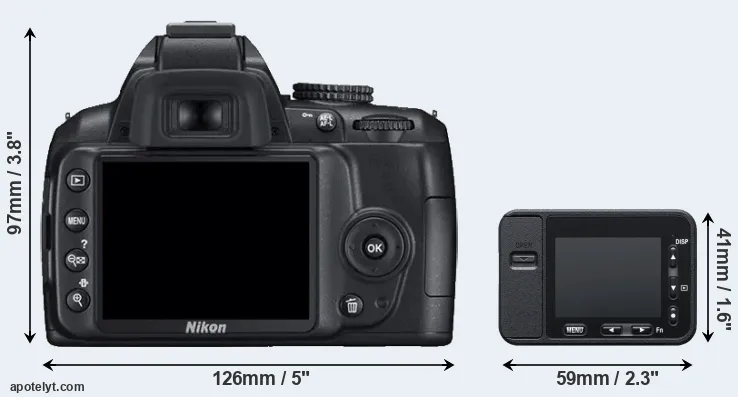 The side-by-side display below illustrates the physical size and weight of the Nikon D3000 and the Sony RX0. The two cameras are presented according to their relative size. Three consecutive perspectives from the front, the top, and the back are available. All width, height and depth measures are rounded to the nearest millimeter.