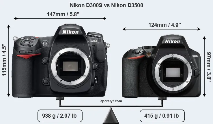 An illustration of the physical size and weight of the Nikon D300S and the Nikon D3500 is provided in the side-by-side display below. The two cameras are presented according to their relative size. Three successive views from the front, the top, and the rear are shown. All width, height and depth dimensions are rounded to the nearest millimeter.