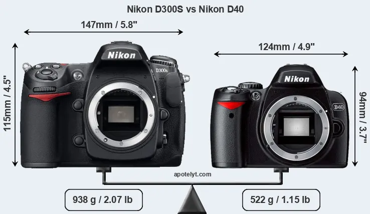 The side-by-side display below illustrates the physical size and weight of the Nikon D300S and the Nikon D40. The two cameras are presented according to their relative size. Three consecutive perspectives from the front, the top, and the back are available. All width, height and depth measures are rounded to the nearest millimeter.