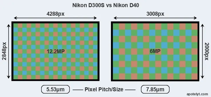 With 12.2MP, the D300S offers a higher resolution than the D40 (6MP), but the D300S has smaller individual pixels (pixel pitch of 5.53μm versus 7.85μm for the D40). However, the D300S is a much more recent model (by 2 years and 8 months) than the D40, and its sensor will have benefitted from technological advances during this time that enhance the light gathering capacity of its pixels.