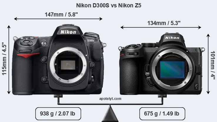 An illustration of the physical size and weight of the Nikon D300S and the Nikon Z5 is provided in the side-by-side display below. The two cameras are presented according to their relative size. Three consecutive perspectives from the front, the top, and the back are available. All width, height and depth measures are rounded to the nearest millimeter.