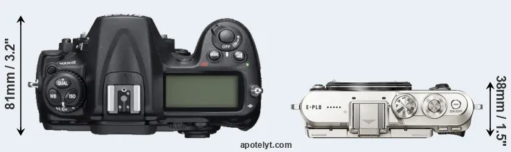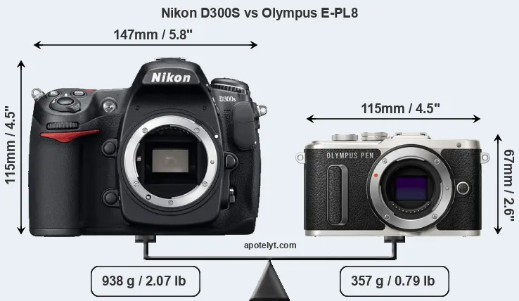 The side-by-side display below illustrates the physical size and weight of the Nikon D300S and the Olympus E-PL8. The two cameras are presented according to their relative size. Three successive views from the front, the top, and the rear are shown. All size dimensions are rounded to the nearest millimeter.