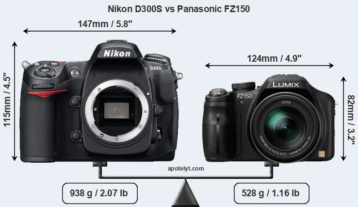 The physical size and weight of the Nikon D300S and the Panasonic FZ150 are illustrated in the side-by-side display below. The two cameras are presented according to their relative size. Three consecutive perspectives from the front, the top, and the back are available. All width, height and depth measures are rounded to the nearest millimeter.
