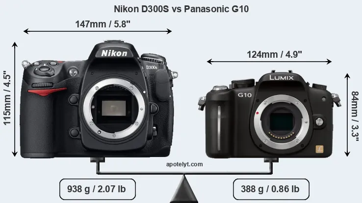 If the front view area (width x height) of the cameras is taken as an aggregate measure of their size, the Panasonic G10 is considerably smaller (38 percent) than the Nikon D300S. Moreover, the G10 is substantially lighter (59 percent) than the D300S. It is worth mentioning in this context that the D300S is splash and dust resistant, while the G10 does not feature any corresponding weather-sealing.