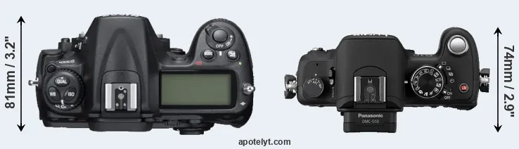 The side-by-side display below illustrates the physical size and weight of the Nikon D300S and the Panasonic G10. The two cameras are presented according to their relative size. Three consecutive views from the front, the top, and the rear side are shown. All width, height and depth dimensions are rounded to the nearest millimeter.