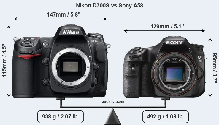The side-by-side display below illustrates the physical size and weight of the Nikon D300S and the Sony A58. The two cameras are presented according to their relative size. Three consecutive perspectives from the front, the top, and the back are available. All width, height and depth measures are rounded to the nearest millimeter.
