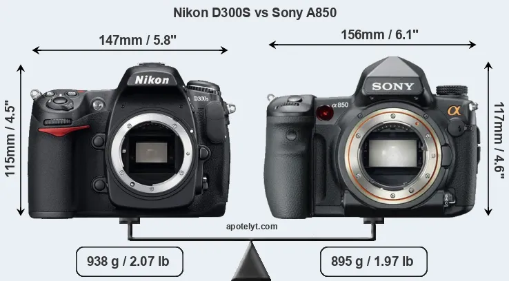 An illustration of the physical size and weight of the Nikon D300S and the Sony A850 is provided in the side-by-side display below. The two cameras are presented according to their relative size. Three consecutive views from the front, the top, and the rear side are shown. All width, height and depth dimensions are rounded to the nearest millimeter.