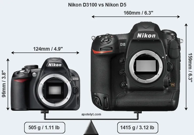 If the front view area (width x height) of the cameras is taken as an aggregate measure of their size, the Nikon D5 is considerably larger (114 percent) than the Nikon D3100. Moreover, the D5 is substantially heavier (180 percent) than the D3100. It is noteworthy in this context that the D5 is splash and dust-proof, while the D3100 does not feature any corresponding weather-sealing.