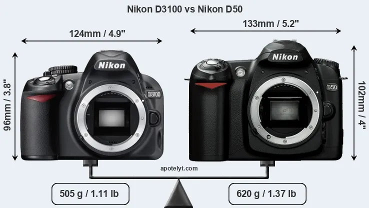 An illustration of the physical size and weight of the Nikon D3100 and the Nikon D50 is provided in the side-by-side display below. The two cameras are presented according to their relative size. Three consecutive views from the front, the top, and the rear side are shown. All width, height and depth measures are rounded to the nearest millimeter.