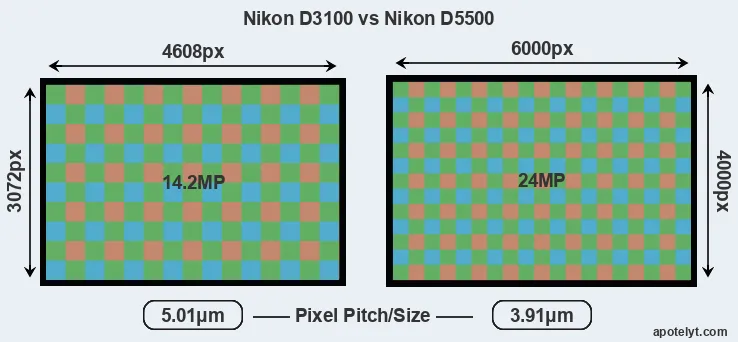With 24MP, the D5500 offers a higher resolution than the D3100 (14.2MP), but the D5500 has smaller individual pixels (pixel pitch of 3.91μm versus 5.01μm for the D3100). Yet, the D5500 is a much more recent model (by 4 years and 4 months) than the D3100, and its sensor will have benefitted from technological advances during this time that enhance the light gathering capacity of its pixel-units. Coming back to sensor resolution, it should be mentioned that the D5500 has no anti-alias filter installed, so that it can capture all the detail its sensor resolves.