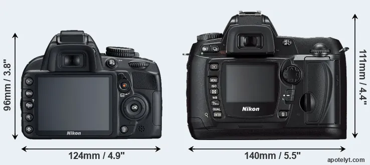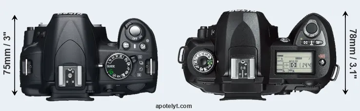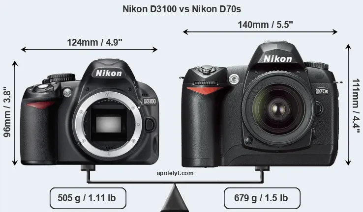 The side-by-side display below illustrates the physical size and weight of the Nikon D3100 and the Nikon D70s. The two cameras are presented according to their relative size. Three successive views from the front, the top, and the rear are shown. All width, height and depth measures are rounded to the nearest millimeter.