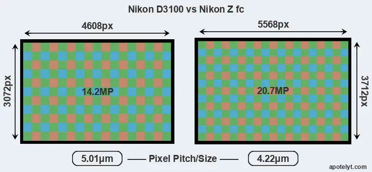 | Sensor Specs | Nikon D3100 | Nikon Z fc |
