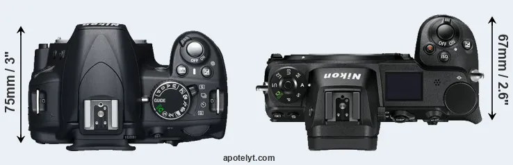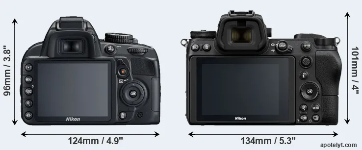 The side-by-side display below illustrates the physical size and weight of the Nikon D3100 and the Nikon Z7. The two cameras are presented according to their relative size. Three consecutive perspectives from the front, the top, and the back are available. All width, height and depth dimensions are rounded to the nearest millimeter.