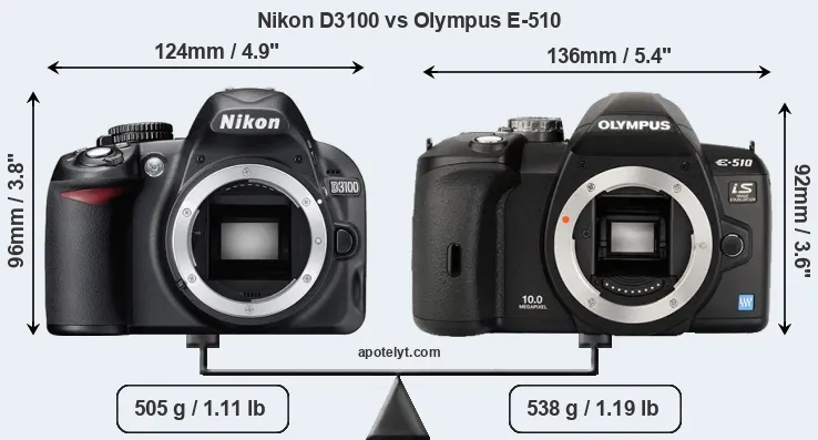 An illustration of the physical size and weight of the Nikon D3100 and the Olympus E-510 is provided in the side-by-side display below. The two cameras are presented according to their relative size. Three successive views from the front, the top, and the rear are shown. All width, height and depth dimensions are rounded to the nearest millimeter.