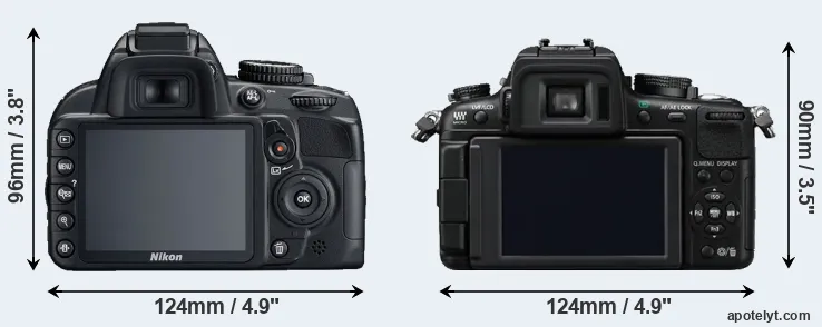 The side-by-side display below illustrates the physical size and weight of the Nikon D3100 and the Panasonic GH2. The two cameras are presented according to their relative size. Three consecutive perspectives from the front, the top, and the back are available. All width, height and depth dimensions are rounded to the nearest millimeter.