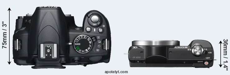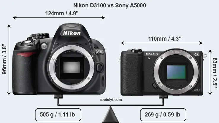 The physical size and weight of the Nikon D3100 and the Sony A5000 are illustrated in the side-by-side display below. The two cameras are presented according to their relative size. Three consecutive views from the front, the top, and the rear side are shown. All width, height and depth dimensions are rounded to the nearest millimeter.