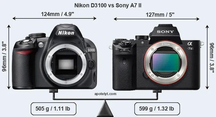 The physical size and weight of the Nikon D3100 and the Sony A7 II are illustrated in the side-by-side display below. The two cameras are presented according to their relative size. Three consecutive perspectives from the front, the top, and the back are available. All size dimensions are rounded to the nearest millimeter.