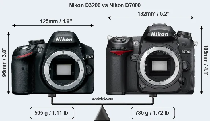 If the front view area (width x height) of the cameras is taken as an aggregate measure of their size, the Nikon D7000 is notably larger (16 percent) than the Nikon D3200. Moreover, the D7000 is substantially heavier (54 percent) than the D3200. It is noteworthy in this context that the D7000 is splash and dust-proof, while the D3200 does not feature any corresponding weather-sealing.